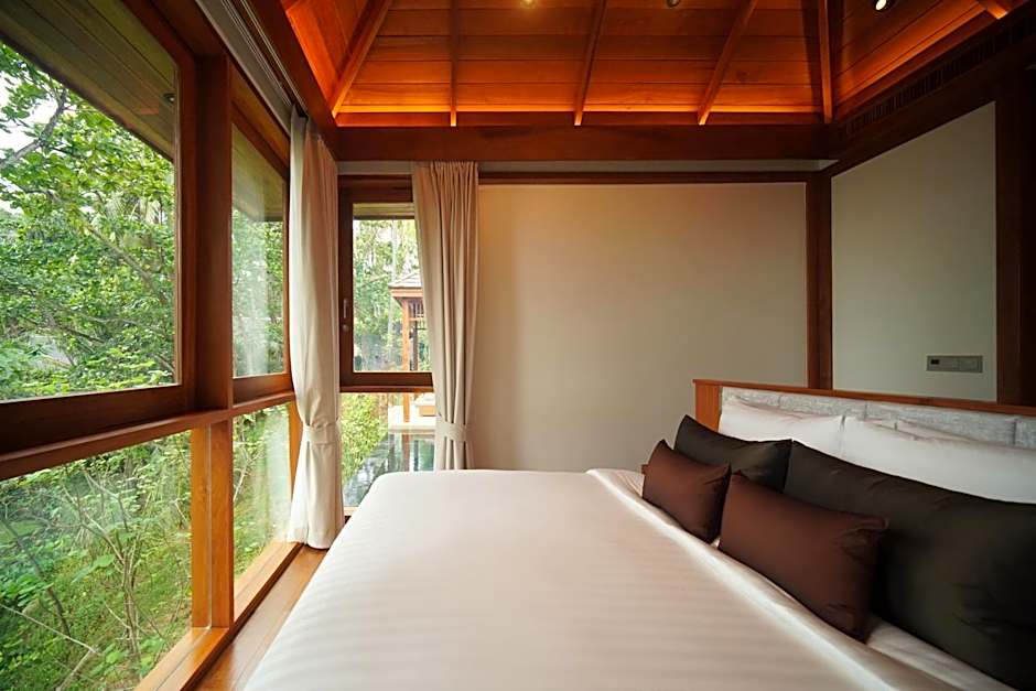Perched high above Pansea Bay with ocean views, these spacious one-bedroom villas offer 90 sqm of living space, with the added luxury of a private infinity-edge pool. Enveloped by tropical vegetation, the stand-alone villas are ideal for guests seeking intimacy and exclusivity, connected by floating walkways that wind through the jungle. By day, the expansive pool area and lounging Sala invite you to make the most of the resort’s outdoor island lifestyle without leaving your villa. By night, the calming interior space is a cocooning space to retreat, complete with a separate lounge area, king-sized bed, walk-in closet, and a bathroom with a double vanity, rain shower and a stylish bathtub. Both contemporary yet welcoming, use of materials such as natural wood and stone encourages relaxation, while floor-to-ceiling windows celebrate the villas’ exceptional setting. This room type can accommodate up to 3 adults or a couple with 2 children. Rooms rates are for 2 adults.
